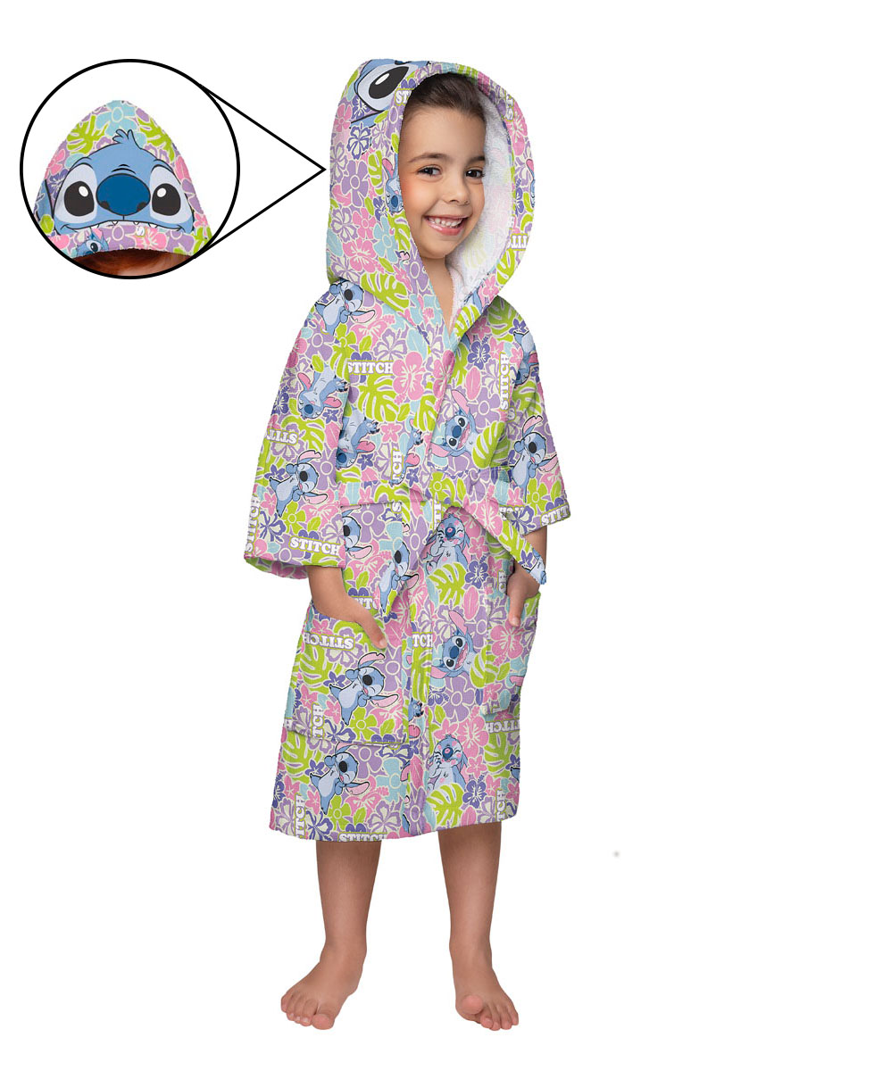 Com um design encantador estampado com o famoso personagem Stitch, este roupão vai encantar as pequenas e tornar a hora do banho ainda mais divertida. O modelo quimono oferece liberdade de movimento, permitindo que as crianças brinquem e se movimentem com facilidade.