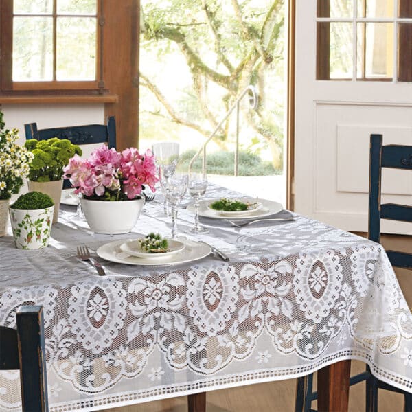 A cor branca desta toalha de mesa adiciona um toque de elegância e sofisticação ao seu ambiente, tornando-a ideal para ocasiões especiais ou para o uso diário. A renda adiciona um toque de luxo e requinte, tornando cada refeição uma experiência verdadeiramente especial.